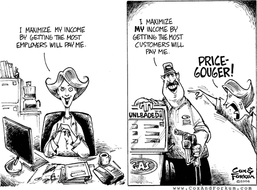 See how ridiculous that is? Like any other retailer, gas sellers can be expected to 'charge what they can get' for their product. But the market controls. If a gas station charges "significantly more" than other stations that are, in fact, "in the immediate vicinity," then you know what happens to that over-priced gas station? It loses its customers to the lower-priced competition. This isn't exactly advanced econ here folks. "Price gouging" is what happens when a commodity is rare and in high demand - like when a ticket broker gets his hands on a few Superbowl tickets and re-sells them at ten times face. That isn't what is happening out there on the mean streets of Massachusetts.