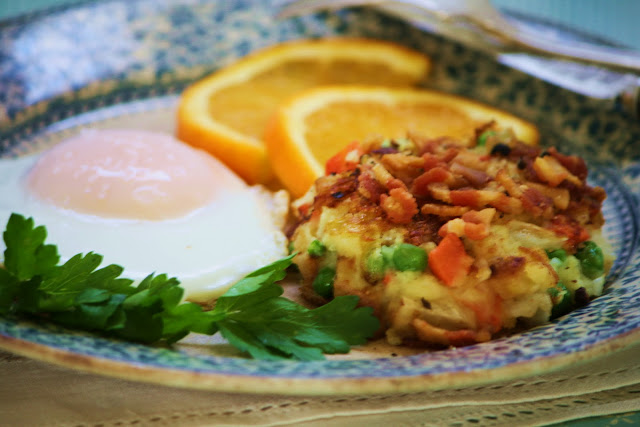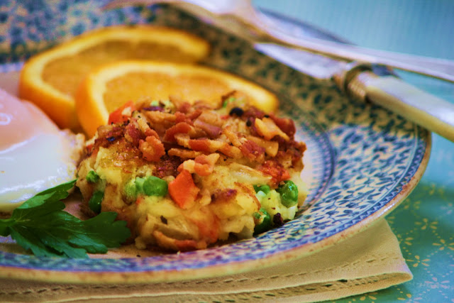 Bubble and Squeak is a traditional British fried dish of left-over vegetables. The name comes from the popping and squeaking sound the densely packed vegetables make as they cook under pressure. Traditionally it was eaten on a Monday for lunch or dinner with a fried egg, bacon, or meat leftovers. From what I can tell, there isn't a specific recipe for Bubble and Squeak, since other than the mandatory base of mashed potatoes that binds all the vegetables, any leftover vegetables from the night before can be used. Most of the recipes I found included cabbage, but other than that, any combination of carrots, parsnips, turnips, brussel sprouts, broccoli and peas be used. Interestingly, in Ireland, the same meal is called colcannon, but uses kale and onions, and in Scotland, it's called rumbledethum. Lastly, according to traditional recipes, animal fat, like lard, should be used to achieve a perfect golden brown exterior. I couldn't bring myself to use lard,...but, I most certainly could use bacon as a mighty and righteous substitute.