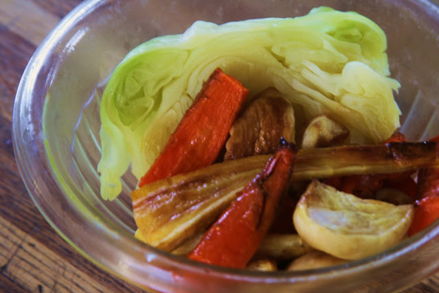Last night's leftovers - Roasted carrots, turnips, parsnips and boiled cabbage