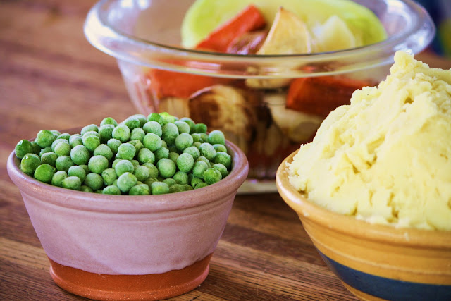 Left over vegetables, mashed potatoes and frozen peas (added frozen, not pre-cooked)