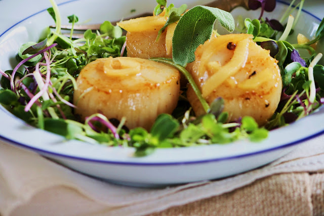 As luck would have it, a little searching led me to the Wampanoag Tribe website, complete with recipes from their cookbook. I chose an amazing scallop dish because it uses local New England ingredients - plus, who in her right mind passes up an opportunity to eat scallops? To compliment these sea-jewels, I found locally-grown sunflower greens and a super-micro mix (seriously, the tiniest greens I've EVER seen), of watercress, mizuna, red giant mustard and crimson mustard. So, while this meal represents only a fraction of the culinary traditions in America, it's a place to start that both honors and celebrates the United States of America, it's first inhabitants and the many immigrants who followed.