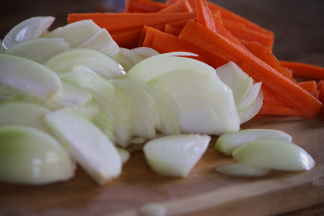 3. Slice the onions thinly and cut the carrots into strips. You should about the same amount of carrots, onions, and chicken.