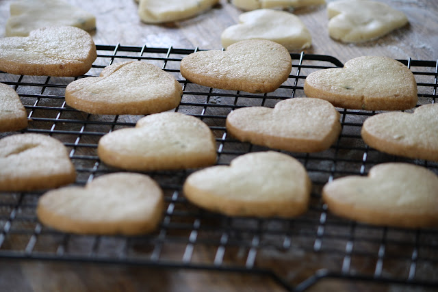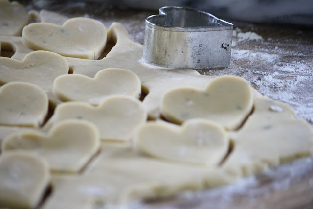 I adapted the recipe by substituting sea salt for kosher salt, because I'm a salt freak, (an inherited trait shared by my brother and sister as well - thanks, Mom.). By using larger grain salt, you get little random crunchy bursts of saltiness throughout the cookie - which makes my tongue ever so happy. You can cut them in any shape you like with a good sharp knife, but I used a heart-shaped cookie cutter because I made these cookies-of-love for the men-folk in my house. Enjoy...
