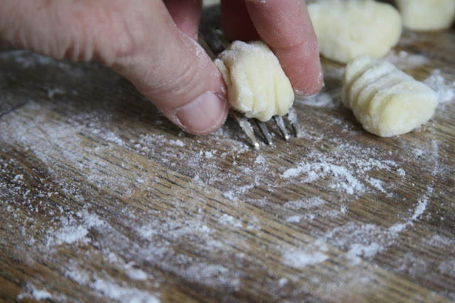 Using the back of a fork, roll each gnocchi down the back of the fork to make a grooved imprint on each one (this apparently catches the gravy better).