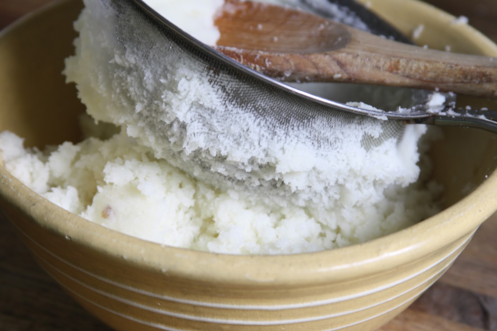 While potatoes are still warm, mash through a sieve. Mix in eggs, flour and salt until mixture is soft.