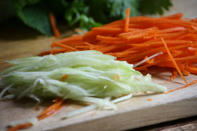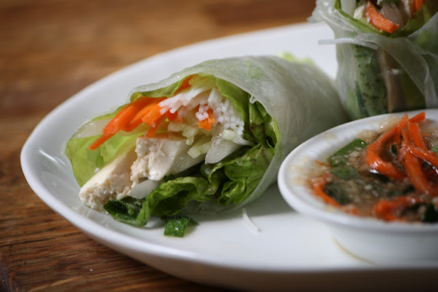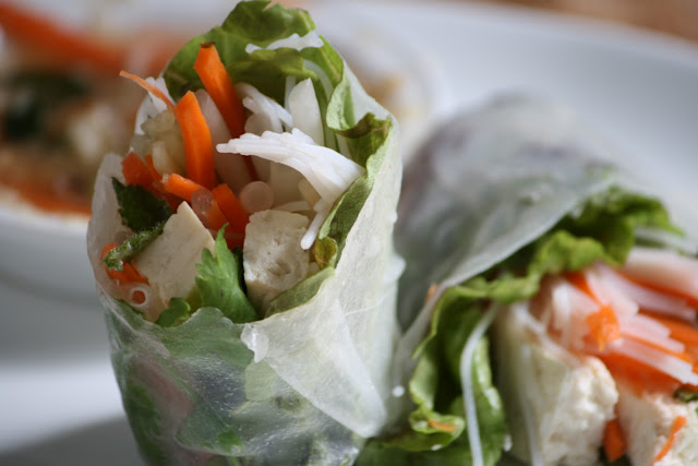 Tuy?t v?i - That's as close as I can come to the Vietnamese translation for the word awesome. Vietnamese food is my very favorite Asian cooking style, as it relies on fresh, clean flavors and is much lighter than my close second favorite, Thai cooking. Plus the standard combination of mint, lemon grass and basil is just insanely, insanely sexy -- in an herby way. Without even thinking about it, I can tell you that any time I'm lucky enough to get to a Vietnamese restaurant, I always order the Spring (Summer) rolls. I love the look and texture of the the rice paper wrappers, crunchy fresh vegetables, chewiness of the tofu, cellophane noodles and sweet/hot mix of the accompanying sauce. And of course, they're just so pretty. I've made won-tons, pot stickers and egg rolls before, but have never attempted these until today. All I can say is...dayyyam, these are slammin'. Working with rice paper took a little getting used to as it's super thin and very delicate, but after a couple of clumsy tries, I got it down. I hope you will too.