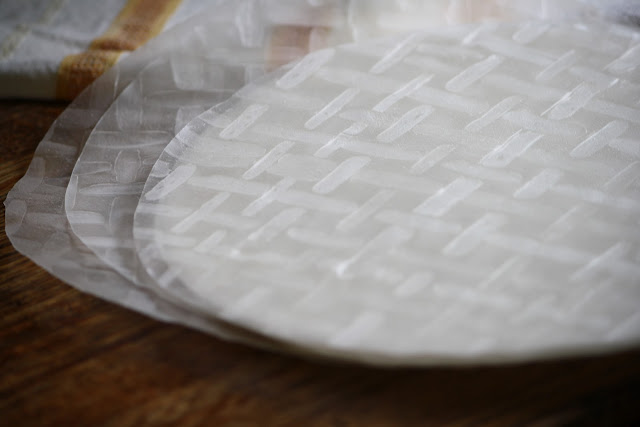 Working with 1 rice-paper round at a time, soak the round in warm water.