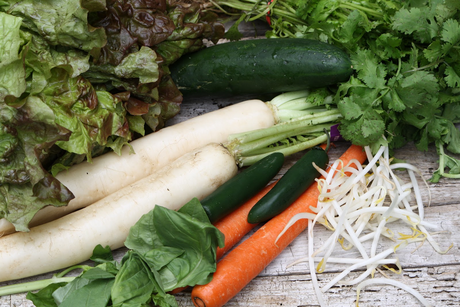 The basics: red leaf lettuce, cucumber, cilantro, mung beans, chilies and daikon