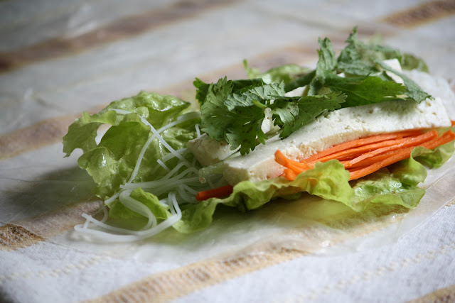 Working on a damp tea towel, lay the rice paper out, then put the lettuce leaf on first then layer the other ingredients - roll into a tight cylinder, tucking the ends in 1/2 way through.