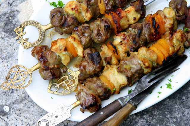 Drain meat from sauce; reserve sauce. Thread lamb, pork, and apricots on skewers. Grill over charcoal until browned on all sides. Serve with heated reserved sauce.