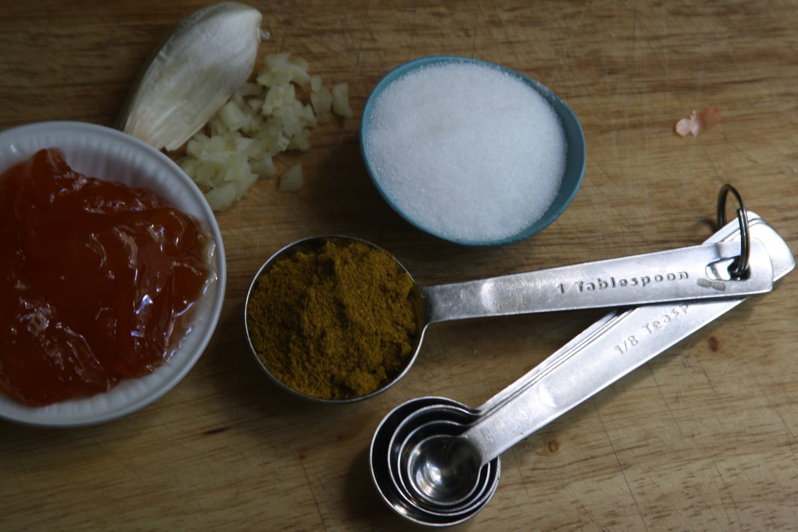 Apricot jam, garlic, salt and curry (not pictured, tamarind paste)
