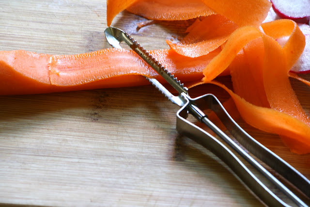 Create wide flat strips by pressing down hard with the vegetable peeler